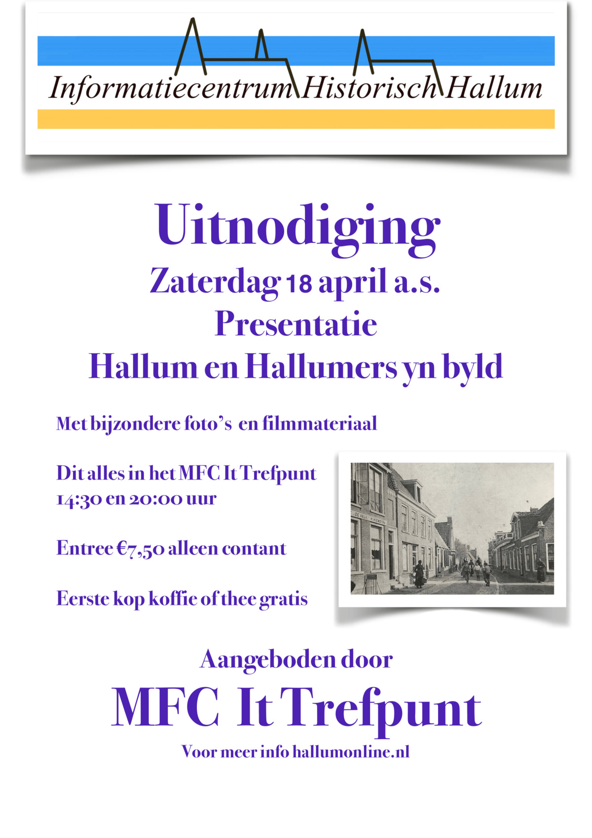 De bijeenkomst vindt plaats in MFC It Trefpunt. Bezoekers worden bij binnenkomst ontvangen met een eerste kopje koffie of thee, aangeboden door MFC It Trefpunt. De entree € 7,50 kan uitsluitend contant worden betaald.