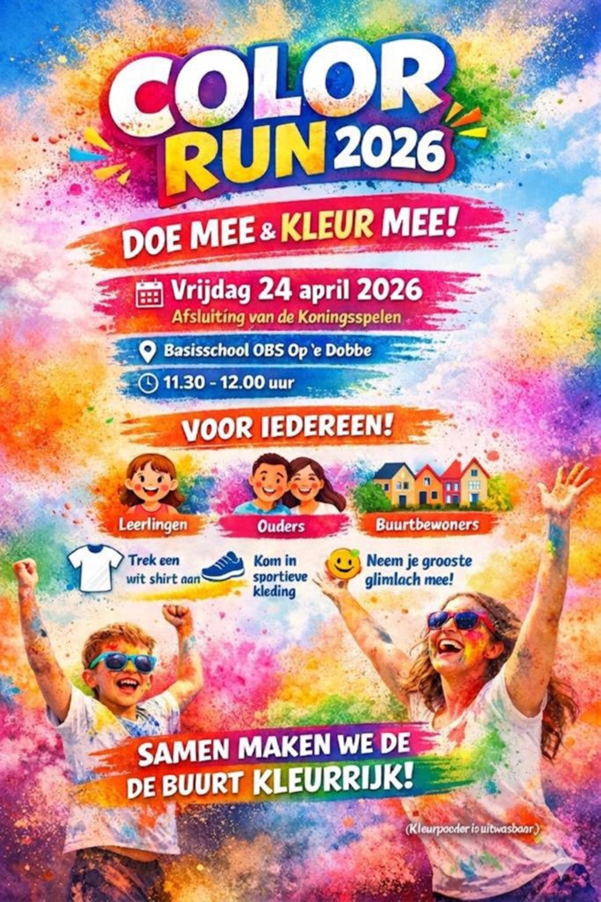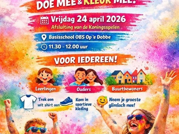 Van 11.30 tot 12.00 uur verandert de omgeving van de school in een vrolijk parcours vol kleurpoeder, muziek en gezelligheid. Jong en oud, leerlingen, ouders, buren en dorpsgenoten: trek je sportschoenen aan en doe mee!