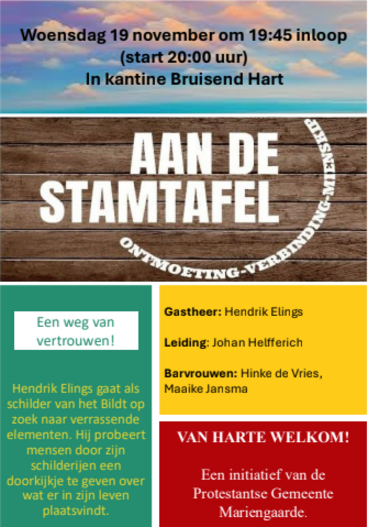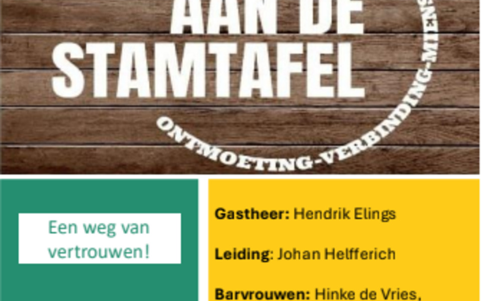 bijbelse reflectie geven op het onderwerp. De volgende stamtafels worden gehouden op de woensdagen: