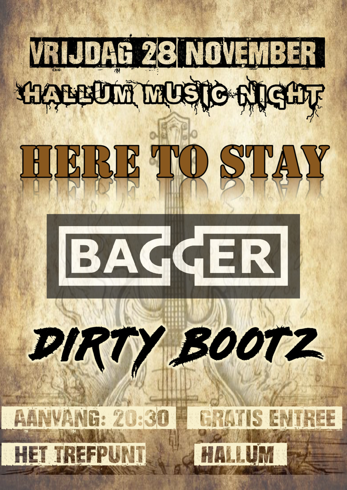 Het programma zit goed vol: om 20.30 uur trapt Here to Stay (uit Hallum en omgeving) de avond af. Om 21.30 uur is het de beurt aan BAGGER, de lokaal bekende punkband met vader en zoon Lap uit Hallum. Rond 22.45 uur sluit Dirty Bootz, een coverband uit Leeuwarden en omgeving, de avond knallend af.