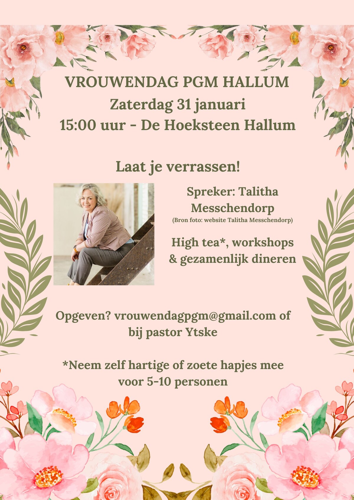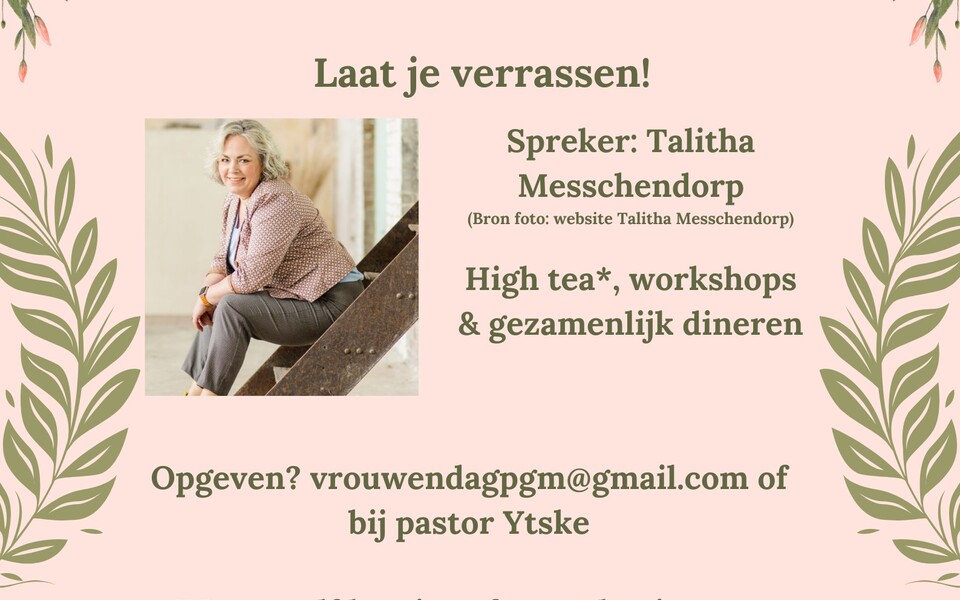 Je kunt je opgeven bij pastor Ytske Machiela via het mailadres vrouwendagpgm@gmail.com. Voor de high tea word je gevraagd om zelf hartige en zoete hapjes mee te nemen.