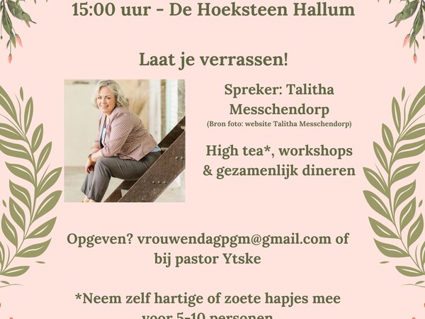 Op zaterdag 31 januari vindt in kerkgebouw De Hoeksteen in Hallum een vrouwendag plaats die wordt georganiseerd door de Protestantse Gemeente Mariëngaarde. Spreker tijdens de bijeenkomst is Talitha Messchendorp en het thema van de middag is "Laat je verrassen!"