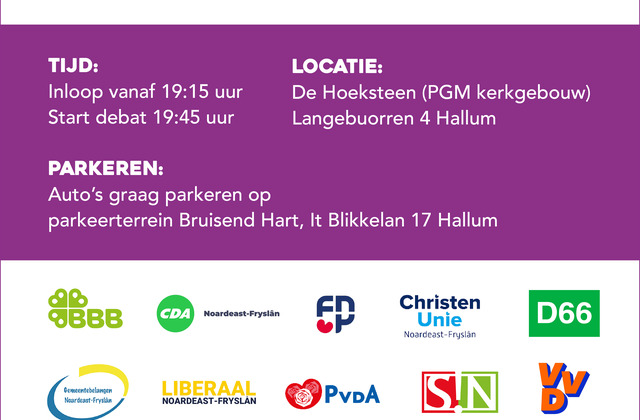Het debat wordt georganiseerd door Doarpsbelang Hallum, met medewerking van PGM Hallum en Trefpunt Hallum. Bezoekers krijgen twee consumpties aangeboden.