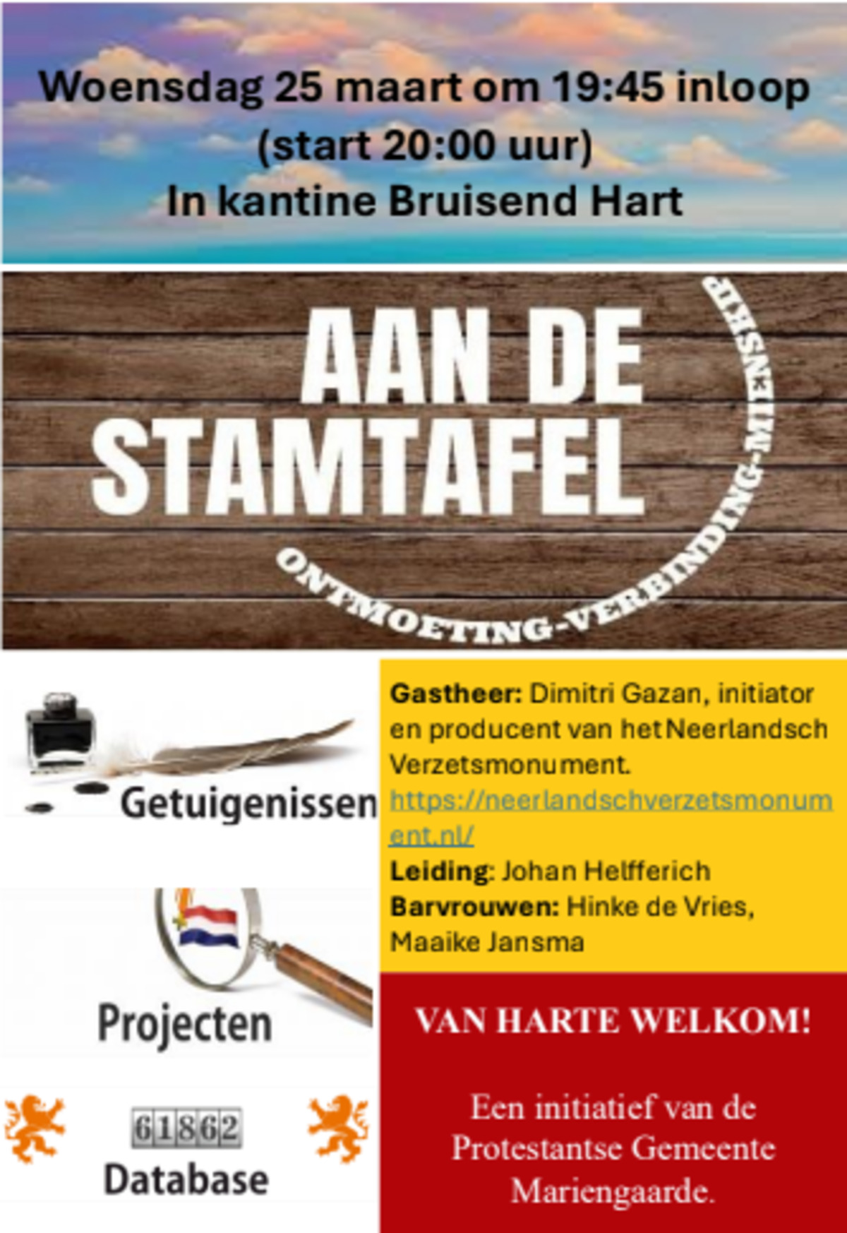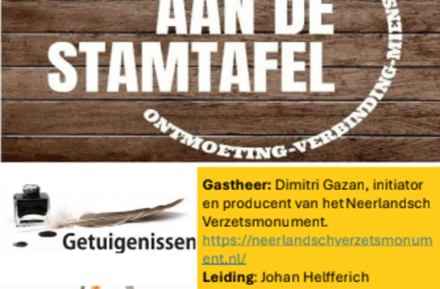 Elke editie van ‘Aan de stamtafel’ heeft een eigen gastvrouw of -heer, en op 25 maart is dat Dimitri Gazan. Hij is initiator en producent van het Neerlandsch Verzetsmonument en vertelt