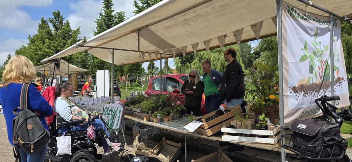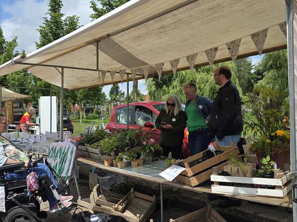 Tijdens een zonovergoten Koningsdag waren de 'Fab Four' Nicky, Henny, Dimi en Pieter aanwezig met een marktkraam vol tomaten en witte kool plantjes, opgekweekt door Herman. Ook sleutelhangers van Henny werden verkocht ten bate van onze dorpstuin. Een prachtige gelegenheid om naamsbekendheid te verwerven in combinatie met een kennismaking met wat de dorpstuin zoal te bieden heeft. Misschien hebben we menigeen kunnen verleiden om ons eens een bezoekje te komen brengen aan de tuin voor een rondwandeling en een bakje koffie of thee daarbij misschien?