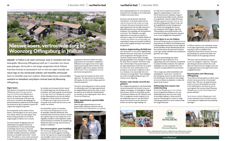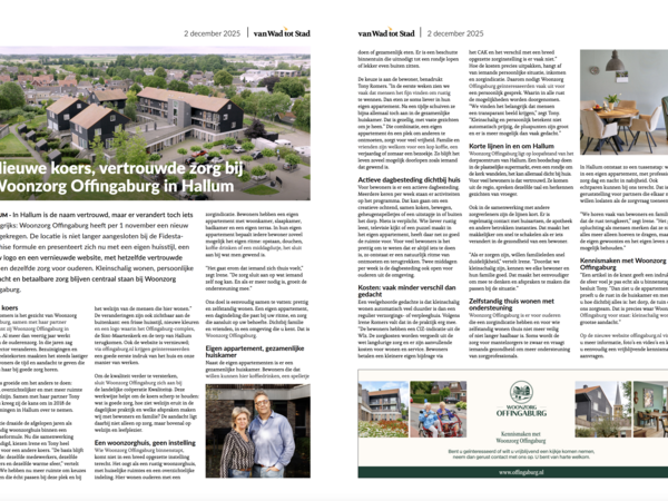 Onlangs stond Woonzorg Offingaburg met een artikel in de regionale huis-aan-huis krant van Wad tot Stad. Daarin vertelden we over de veranderingen van de afgelopen tijd: een frisse nieuwe uitstraling, een eigen koers én dezelfde vertrouwde zorg in Hallum. De krant wordt vooral in Noordwest-Friesland rondgebracht, zoals in de gemeente Waadhoeke en Harlingen, niet standaard in Hallum.