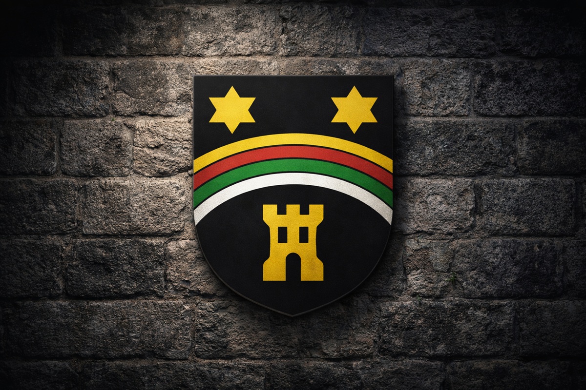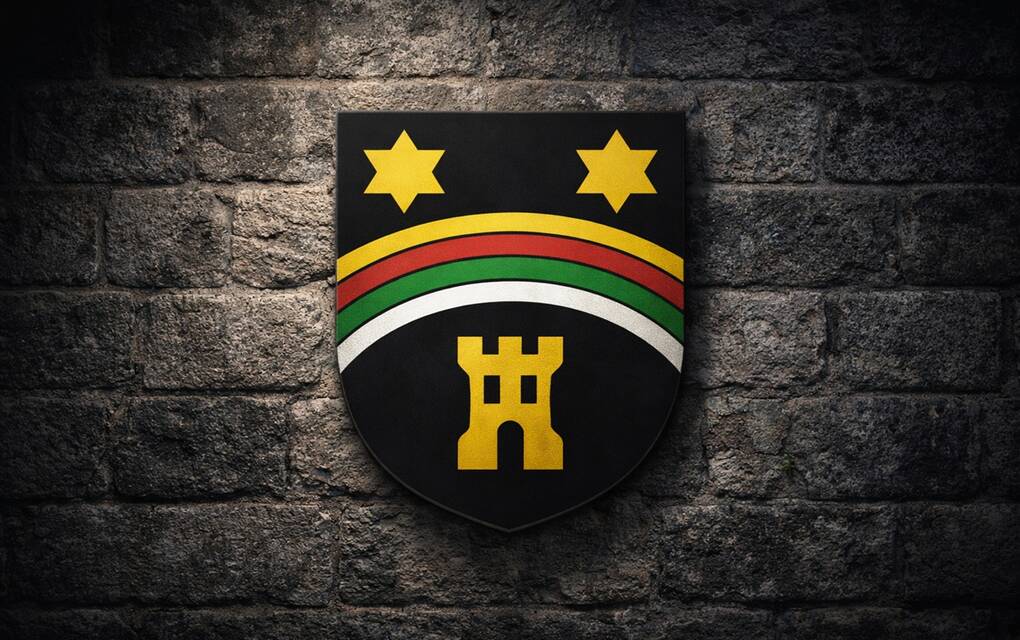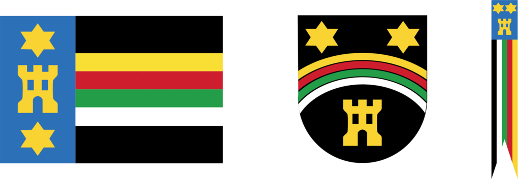 - en de verwijzing naar het voormalige gemeentewapen en de vroegere gemeentevlag via geel op blauw
